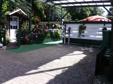 Die Ferienwohnung gehört zu einer ca. 170 m² großen gemütlchen Außenanlage mit 2 Terrassen, einer Grillecke, einem kleinen Teich, einem großen Carport und einem Fahrradunterstand.