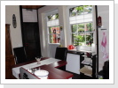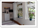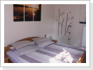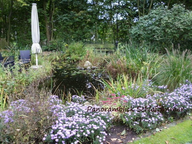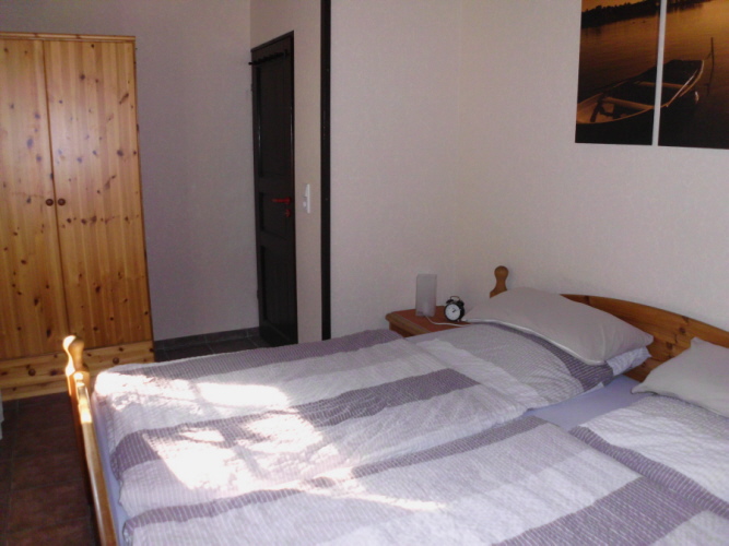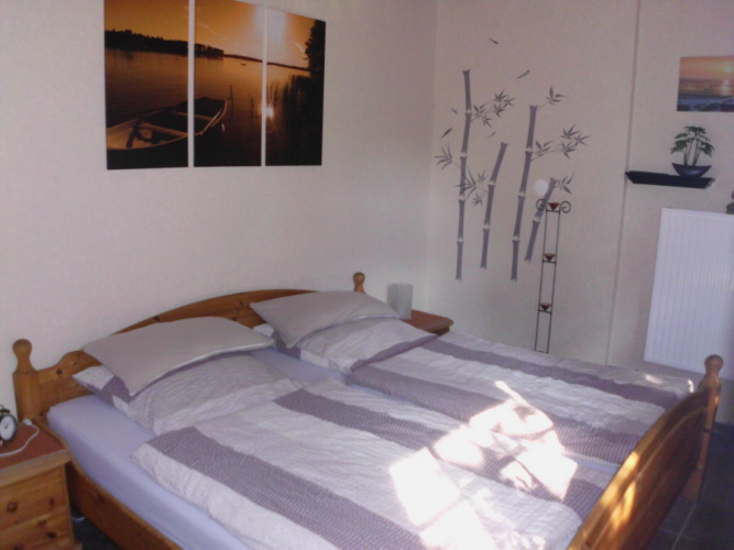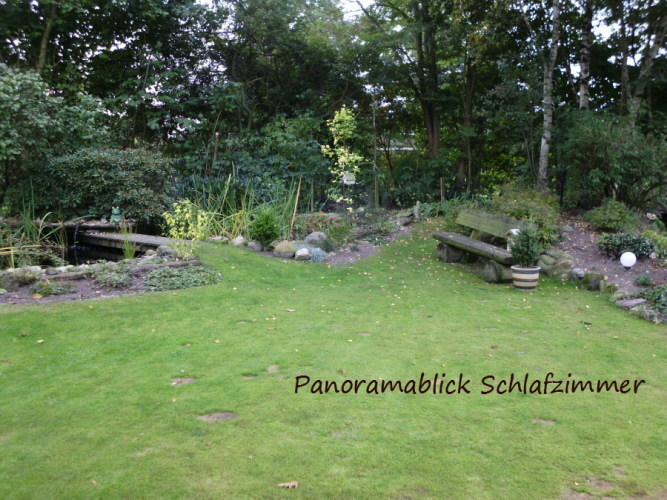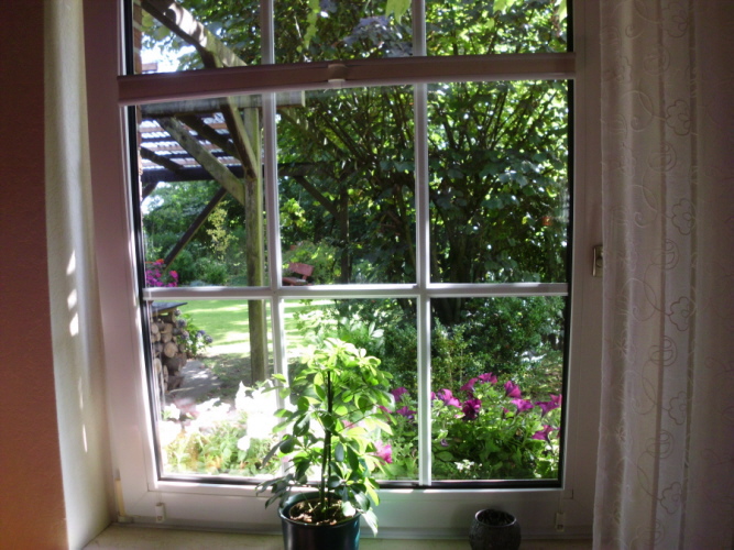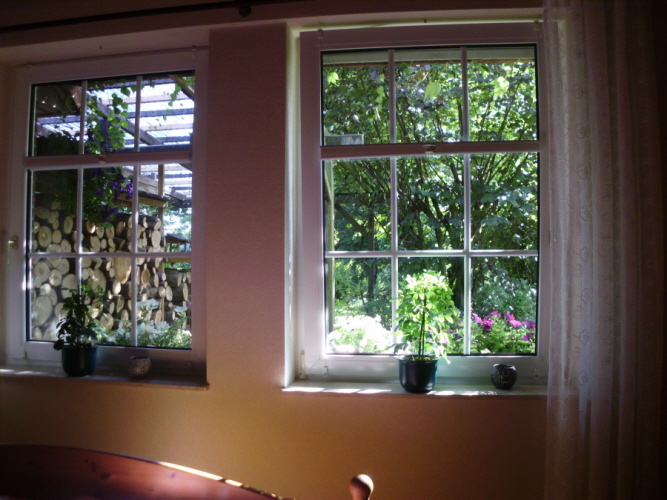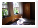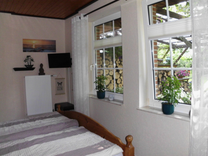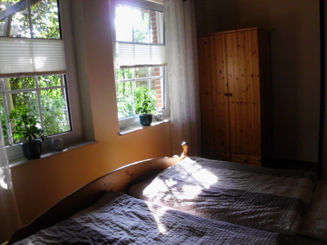Das freundliche, total ruhig gelegene Schlafzimmer, ist mit seinen zwei großen Fenstern nach Süden mit Blick zum naturbelassenen Garten ausgerichtet.