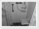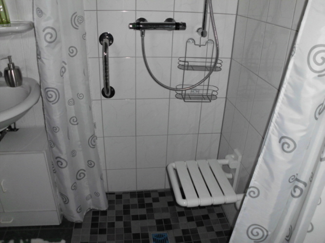 Die Dusche ist ebenerdig, und bei Bedarf kann das Duschbad auch in einer angenehmen Sitzposition vorgenommen werden. Am WC befindet sich ein Stützgriff.