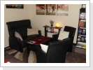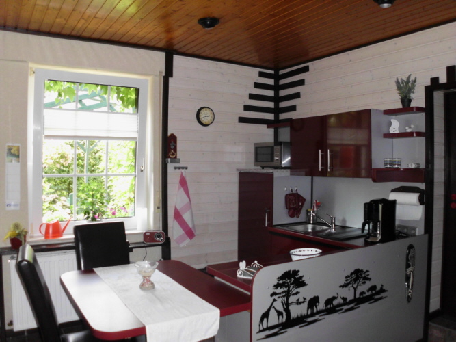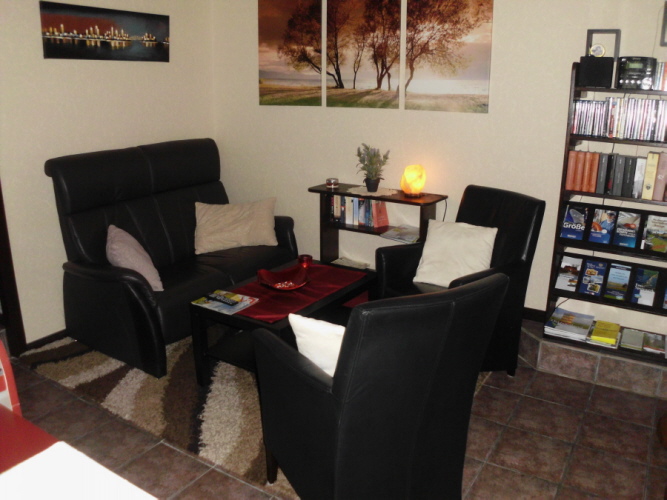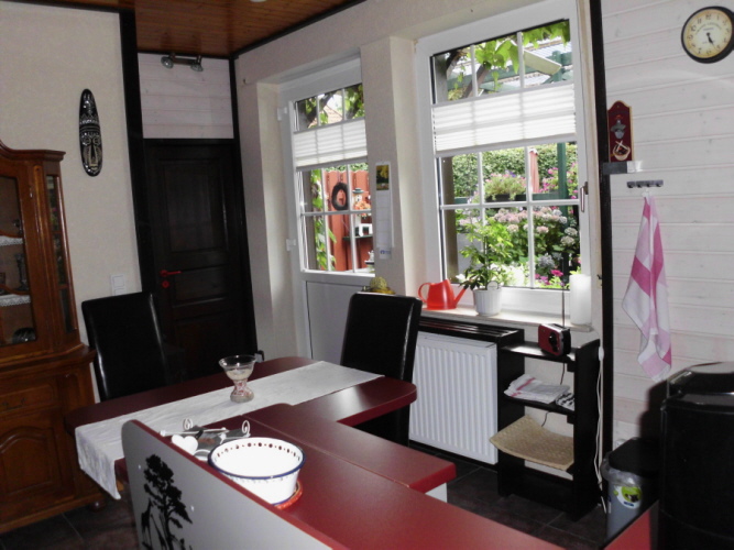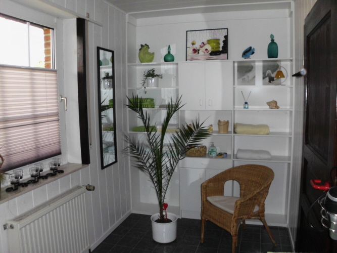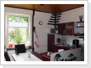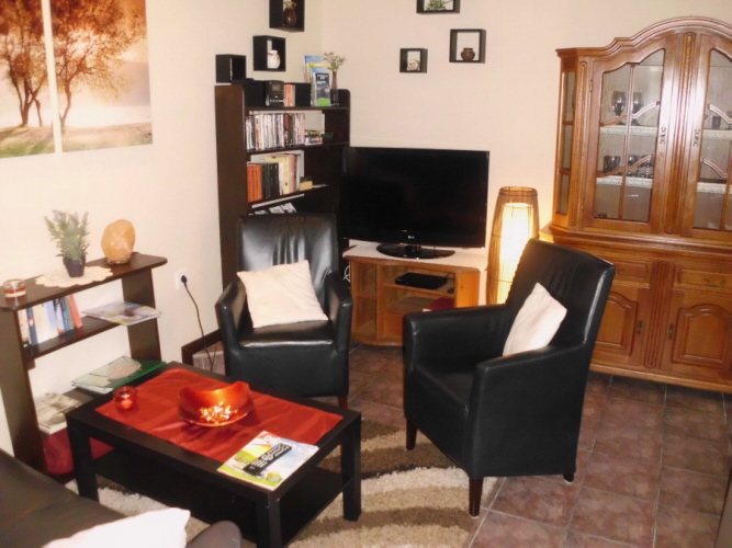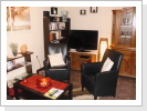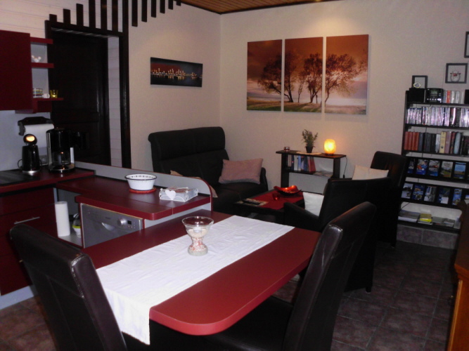 Im Wohnbereich läßt es sich gut relaxen. Haben sie einen Laptop dabei? WLAN ist vorhanden. Der große Flachbildschirm lädt zu einem gemütlichen Fernseh- oder DVD Abend ein. Musikfreunde können sich mit CDs unterschiedlichster Musikrichtungen Hörgenuss verschaffen und in einer kleinen "Bücherei" finden sie vielleicht die passende Lektüre.